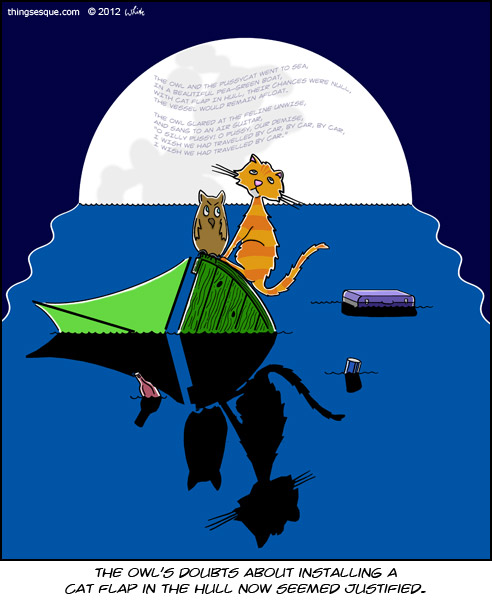 Thinking about cats and their use of cat flaps, it occurred to me that the cat in “The Owl and the Pussy cat” poem would probably like a cat flap to get in and out of the boat at will (not that there is anywhere to go out at sea). This, naturally, would have devastating consequences on their pea-green boat’s ability to resist water.