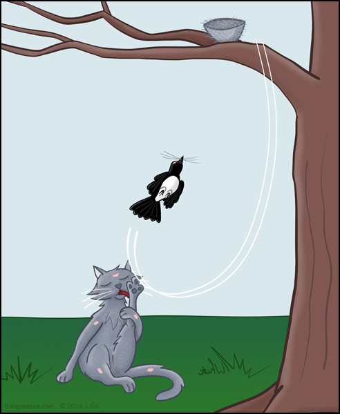 Fur flies in an angry cat attack as a willy wagtail plucks its nesting material from an indifferent cat sitting below the bird’s nest.