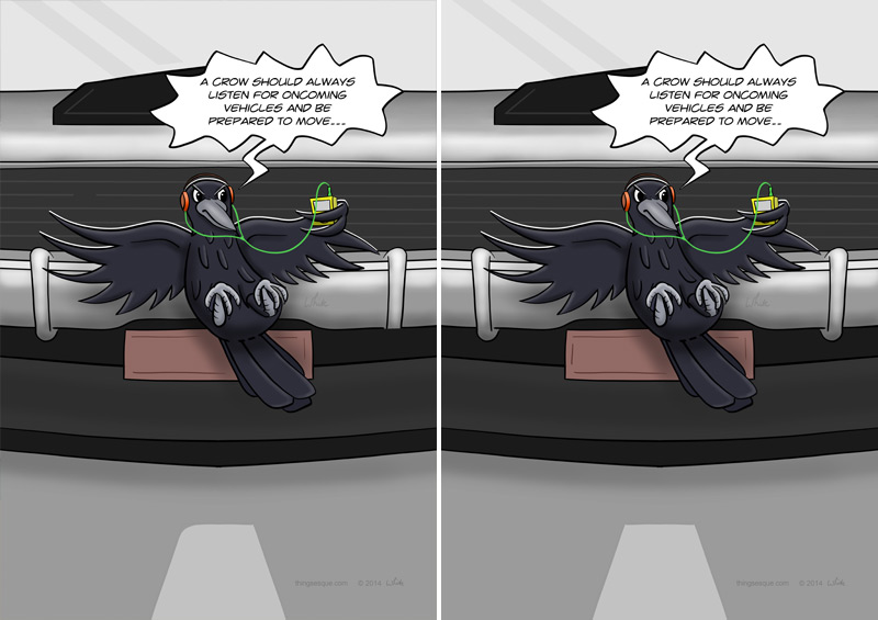 A crow has been hit by a car while listening to a self-help audio file. Oddly enough, a second crow is hit by an almost identical car at the same time in a parallel universe. There are ten differences between these snapshots of parallel universes. How many can you find? Some are very obvious while others are subtle. Differences can include line additions or removals, colour changes and / or object displacement.