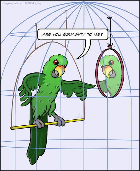 A temper flares within a bird cage when a parrot confronts its reflection in an attempt to start a cage fight.