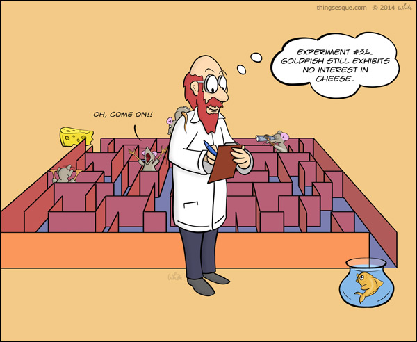 Somewhere in a laboratory, a scientist documents the ability of a goldfish in a bowl, to complete a maze with cheese as a reward. Lab rats in a maze also attempt to reach the cheese. The result is a puzzled goldfish (and scientist).
