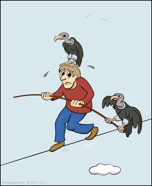 Two vultures drop in on a man trying to tightrope walk across a chasm. They cause him to feel a bit uneasy about the success of the endeavour. The tightrope trip becomes a vulture venture.