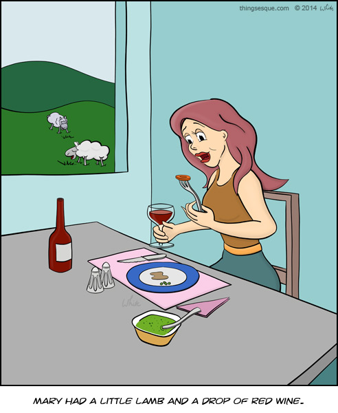 Mary had a little lamb and a drop of red wine. She ate until she was content, while sheep grazed in the fields outside her window, oblivious to the loss of one of their own.