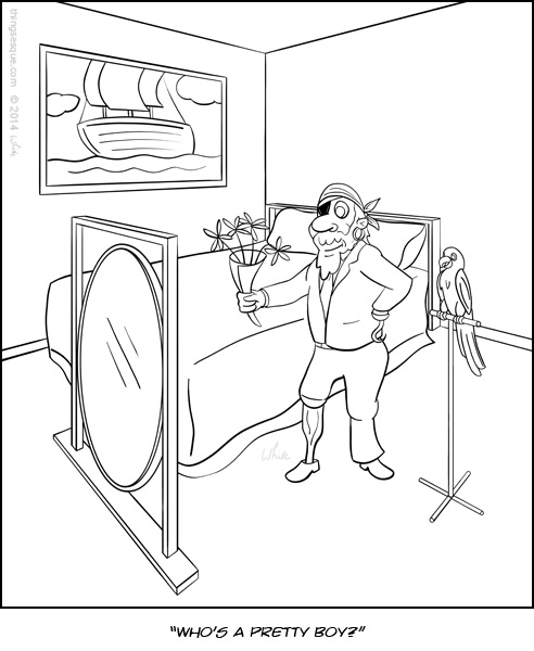 “Who’s a pretty boy?”, said the parrot of its pirate owner as he put on his best suit and checked himself out in the mirror in preparation for his hot date.