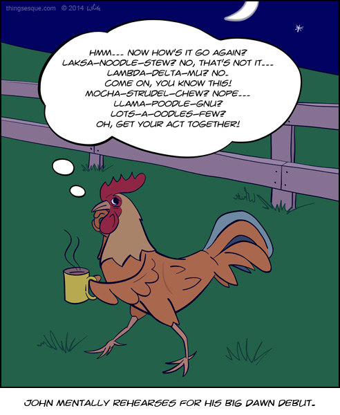Dawn is imminent and John the rooster, with the aid of a cup of coffee, is mid rooster rehearsal in preparation for his big début. If only he can recall the words.