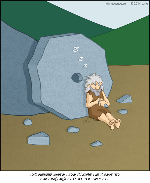 A rough, almost circular shaped rock leans against a boulder. At its base, a worn-out, industrious caveman sits asleep at the wheel (very nearly), no doubt dreaming of better methods of transportation than walking.