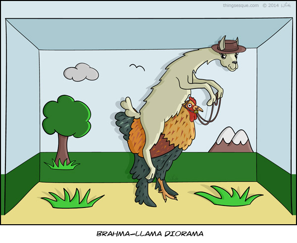 A llama rides a giant brahma within a diorama for no apparent reason (apart from the words rhyming).