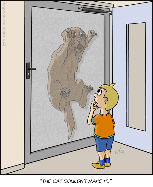 A small boy expects to find the cat at the door but instead is confronted by a missing cat, replaced by a large dog clinging to the security door.