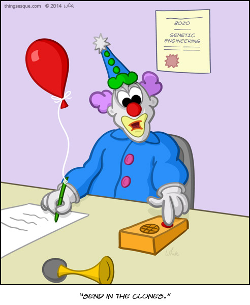 A clown sits in his office writing with a red balloon attached to his pen. Simultaneously he pushes an intercom button and requests for his secretary to “send in the clones”. In the background, a genetic engineering certificate can be seen on the wall.