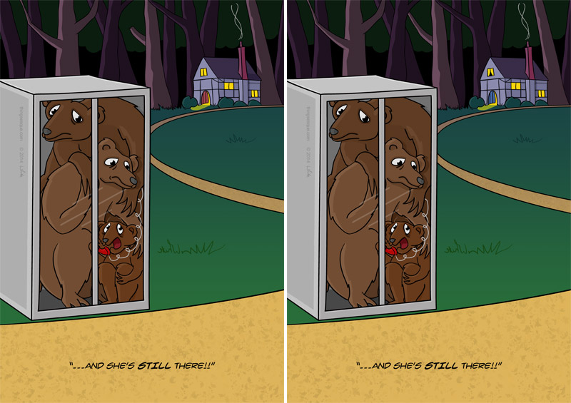 The three bears return from a walk in the woods to find their porridge, chairs and beds have been tested out by Goldilocks and she is found still asleep in Baby Bear’s Bed. They race off to the nearest phone booth to report the break in, but while they are there, the whole crime scene is tampered with. Ten anomalies have occurred and are evident in this image. How many can you find? Some are very obvious while others are subtle. Differences can include line additions or removals, colour changes and / or object displacement.