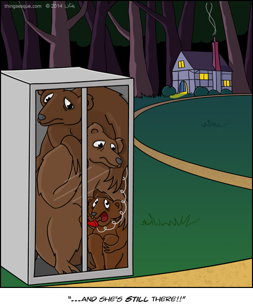 The three bears flee from their house in fear of Goldilocks who was found sleeping in baby bear’s bed. They find the nearest phone box, pile in and make an emergency call for help.