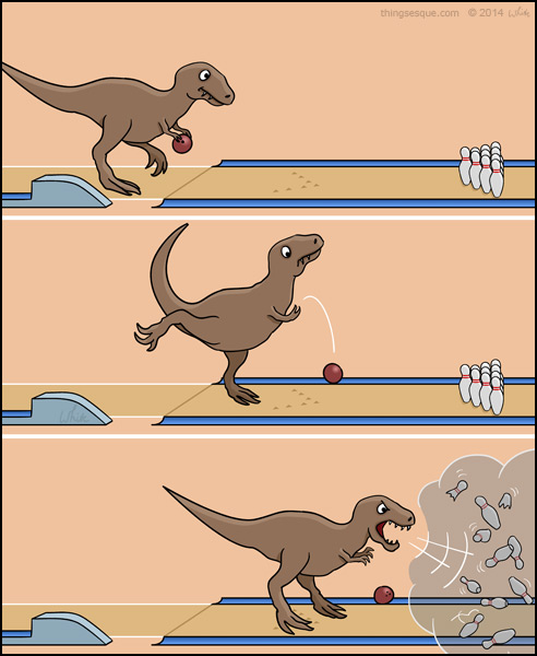 A Tyrannosaurus rex attempts ten pin bowling but discovers his arms aren’t sufficiently strong enough to aim well or power the ball to the end of the bowling lane. Annoyed with the gutter ball result it moves forward and obliterates the pins with an angry growl.