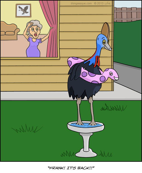 A cassowary with a flotation device bathes in a backyard bird bath. A surprised woman observes through a window, calling for her husband.