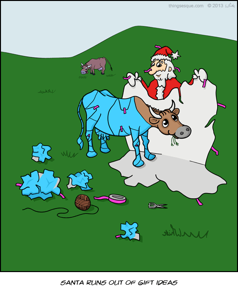After years of Christmas Eve present deliveries, Santa runs out of gift ideas. A cow in a field becomes an unlikely candidate.
