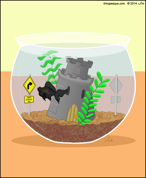 A black moor swims around in a fish bowl discovering a road sign every half lap, indicating a curve ahead.