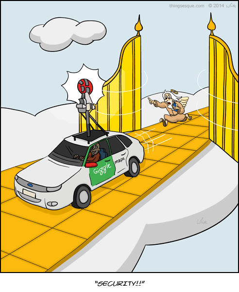 A Street View car bursts through the pearly gates of heaven to photograph the streets of gold. St. Peter chases behind, calling for back up on his walkie talkie.