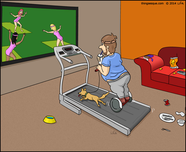 An overweight man rides a Segway on a treadmill while walking the dog and watching an aerobics workout on TV.
