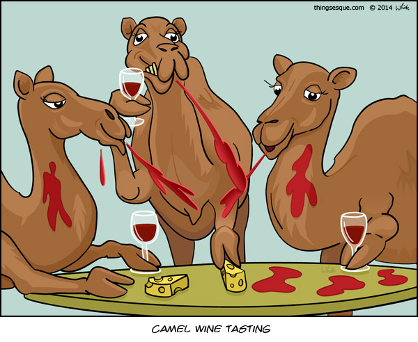 Three camels attend a wine tasting event which results in red wine being distributed generously by each.
