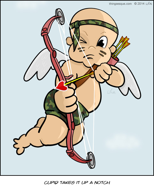 Cupid takes it up a notch by donning his camouflage diapers & headband. With newly upgraded compound bow, he’s on a mission to have people fall in love. Prepare to be hunted.