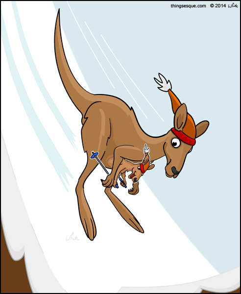A kangaroo skis down a mountain, surprised to find that her joey in pouch has ski poles and is anticipating the kangaroo ski jump ahead.