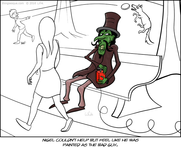 An ominous looking man sits on a park bench, dressed in villain-like attire, seemingly on the verge of committing a crime. Nigel had been painted as the bad guy.