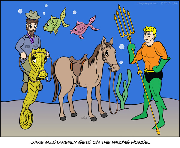 A cowboy mistakenly gets on the wrong horse which happens to belong to Aquaman.