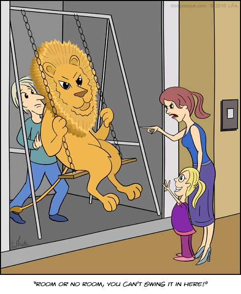 As the lift doors open, a woman and her daughter are confronted with a man pushing a lion on a swing set. A heated discussion about whether or not one should swing a cat in a lift ensues.