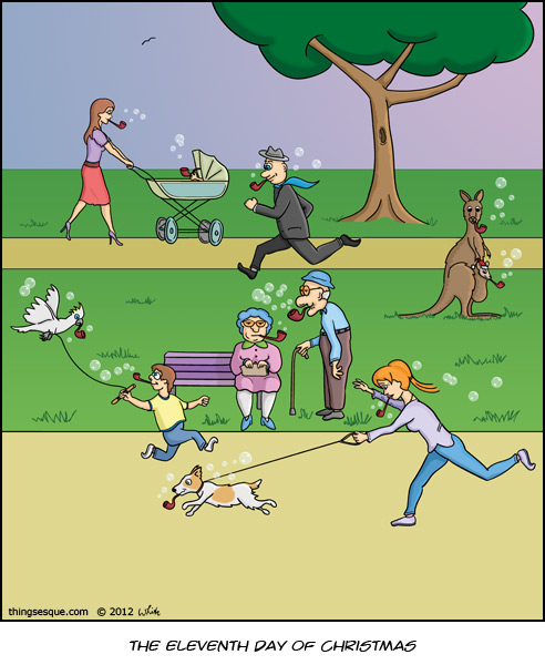 Considerations for this cartoon included chefs / cooks, piping icing onto a cake and plumbers bearing wrenches, working on pipes. I wanted to be able to draw a collection of eleven characters, but have them do their own things while still being tied together by a ‘piping’ theme. Cake decoration and plumbing felt a bit restrictive (as did the original common version with people playing flutes).