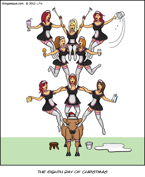 Eight milk (and yet French) maids form a misshapen pyramid (cheerleader-style) on top of a worried looking cow, in what looks to be an advertisement for dairy products.