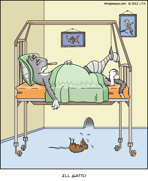 An ill cat with a broken leg lies in a hospital bed while a mouse laughs on the floor underneath.