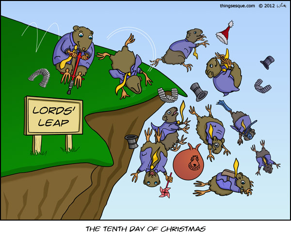 Ten regal-looking lords in purple jackets and gold ties are leaping off a cliff (with various other items) in the form of a lemming avalanche.