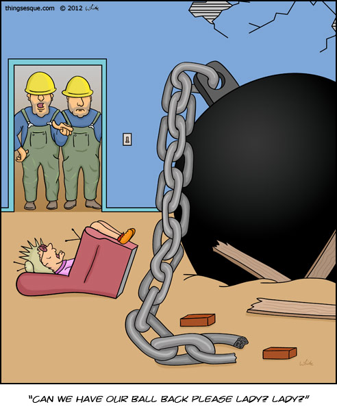 Two demolition workers arrive at the apartment of a shocked and possibly deceased elderly lady to retrieve their wayward wrecking ball (and chain).