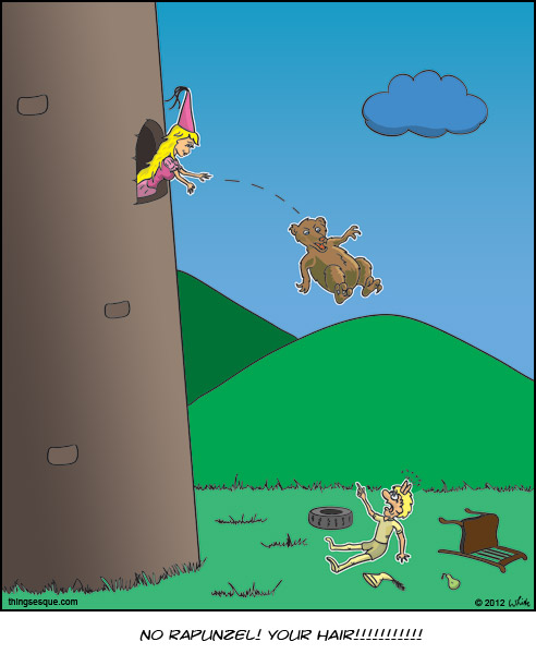 A hearing impaired Rapunzel throws down random objects at the pleas of her knight without shining armour. This was the idea for the Rapunzel cartoon. I could have easily included many other items rhyming with ‘hair’, but the list items were becoming a bit obscure and it probably would have been overkill.