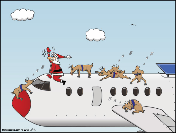 I figured I’d give Santa a bit of a break after having him bounding across the desert. This cartoon has him and his poor exhausted reindeer resting on top of a plane.
