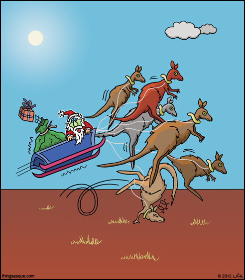 Many years ago, Rolf Harris sang a song called “Six White Boomers”. It was about a team of kangaroos leading Santa across the Australian outback. When I first listened to the song, I think I imagined the trip as shown in the cartoon here.