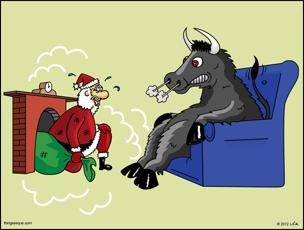 Although it is known that bulls can’t actually see the colour red as humans do, it is still a common misconception that they can. This cartoon subscribes to the erroneous belief, throwing Santa into the awkward situation of emerging from a fireplace to be confronted with a less than impressed bull at the brink of his tolerance for such a flamboyant intruder.