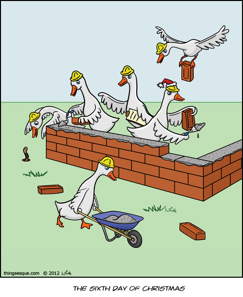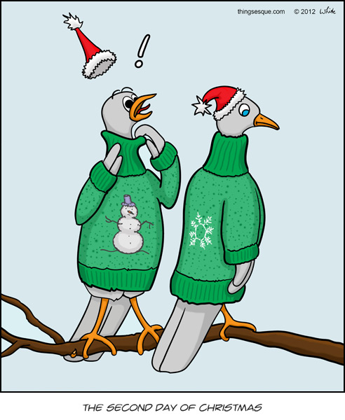 This cartoon is probably a little more obscure than the last one. If you’re not familiar with the carol and were looking at this, you probably wouldn’t know what was going on. I was thinking of drawing doves with turtle shells, but upon Googling the subject, I found there were already similar images released into the wild web. I then decided…