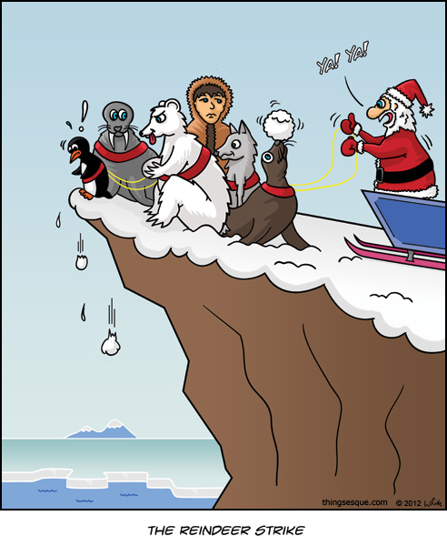 This cartoon is indicative of the inherent perils Santa must face as he delivers gifts on Christmas Eve. I thought about typical car travel problems faced, such as the inevitable flat tyre that needs to be replaced and considered what the equivalent might be for a team of reindeer pulling a sleigh.
