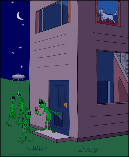 Little green beings from another world, land their craft and walk to their visitation destination. Unbeknownst to them, a dog within the house has heard their doggy door entry attempt and prepares a Martian attack.